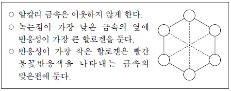 철수는 알칼리 금속 Li, Na, K과 할로겐 Cl2, Br2, I2 를 설명에 따라 그림에 배치하였다.