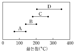 그림은 원유를 분별증류할 때 분리되어 나오는 물질 A~D의 끓는점 범위를 나타낸 것이다.
