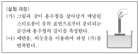 [과목 구분 없음] 다음은 액체의 종류에 따른 표면장력의 크기를 비교하기 위한 실험이다.