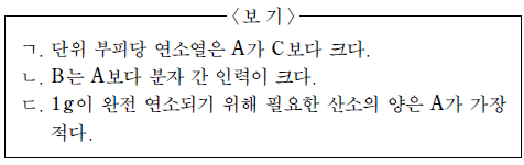 A~C에 대한 설명으로 옳은 것만을 <보기>에서 있는 대로 고른 것은? (단, 밀도는 25℃, 1 기압에서 측정한 값이다.) [3점]