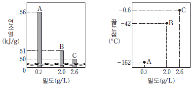 그림은 탄화수소 A~C의 성질을 나타낸 것이다. A~C는 각각 CH4, C3H8, C4H10 중 하나이다.