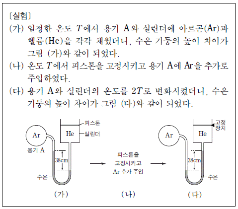 이 실험에 대한 설명으로 옳은 것만을 <보기>에서 있는 대로 고른 것은? (단, T 는 절대 온도, 대기압은 760mmHg이고, 유리관의 부피와 피스톤의 질량 및 마찰은 무시한다.) [3점]