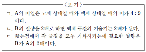 그림은 같은 질량의 고체 물질 A와 B를 단위 시간당 일정한 열량으로 가열하여 기체가 될 때 시간에 따른 온도를 나타낸 것이다.