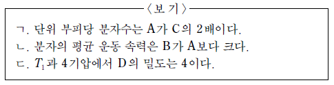 A~D에 대한 설명으로 옳은 것만을 <보기>에서 있는 대로 고른 것은? (단, 절대 온도 T2 는 T1 의 2 배이다.) [3점]