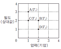 그림은 기체 A~D 의 절대온도, 압력, 밀도의 관계를 나타낸 것이다.