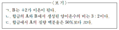 A와 B로 만들어진 어떤 합금이 충분한 양의 HCl과 모두 반응할 때, A와 B가 산화되어 각각 발생한 수소 기체의 부피비는 3 : 1이다. 이 반응에 대한 설명으로 옳은 것만을 <보기>에서 있는 대로 고른 것은? (단, 원자 A와 B의 상대 질량비는 3 : 7이다.) [3점]