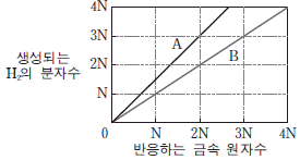 그림은 금속 A와 B가 염산(HCl)과 반응할 때, 반응하는 금속 원자수에 따라 생성되는 수소(H2)의 분자수를 나타낸 것이다.