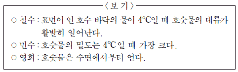 이에 대해 옳게 설명한 학생만을 <보기>에서 있는 대로 고른 것은? (단, 호숫물은 순수한 물이라고 가정한다.) [3점]