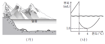 그림 (가)는 겨울철에 표면이 언 호수의 모습을, (나)는 온도에 따른 물 1g의 부피를 나타낸 것이다.