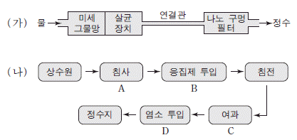 그림 (가)는 휴대용 간이 정수기의 구조를, (나)는 수돗물의 정수 과정을 모식적으로 나타낸 것이다.