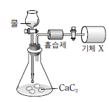 그림은 칼슘카바이드(CaC2)와 물을 반응시켜 탄화수소 기체 X를 발생시키는 장치를 나타낸 것이다.