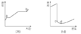 [과목 구분 없음] 그림 가 ( )는 일정량의 얼음을 가열할 때 시간에 따른 온도를, (나)는 온도에 따른 얼음과 물의 부피를 나타낸 것이다.