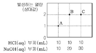 혼합 용액 A~C에 대한 설명으로 옳은 것만을 <보기>에서 있는 대로 고른 것은? (단, HCl(aq), NaOH(aq)의 처음 온도는 같다.) [3점]