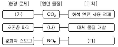 그림은 환경 문제와 원인 물질, 대책을 연결하여 나타낸 것이다.