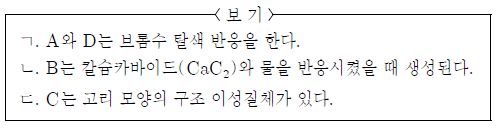 탄화수소 A∼D에 대한 설명으로 옳은 것만을 <보기>에서 있는 대로 고른 것은?
