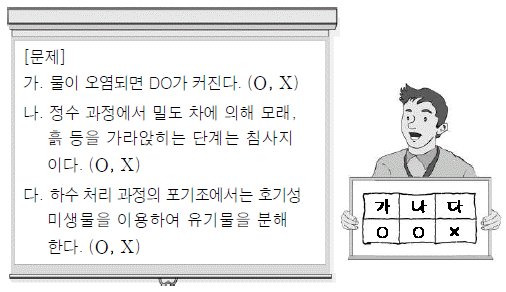 다음은 물의 오염과 정수에 관련된 문제와 그 문제에 철수가 답한 내용을 보여주는 장면이다.