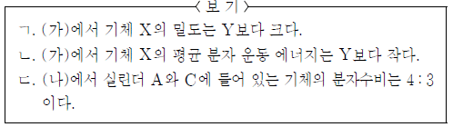 이에 대한 설명으로 옳은 것만을 <보기>에서 있는 대로 고른 것은? (단, 대기압은 1기압이고, 연결관의 부피와 피스톤의 마찰은 무시하며, 콕의 구멍 크기는 같다.) [3점]