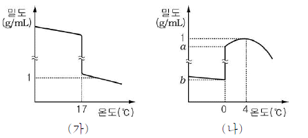 그래프 (가)는 온도에 따른 물질 의 고체와 액체 상태에서의 밀도를, (나)는 온도에 따른 얼음과 물의 밀도를 나타낸 것이다.
