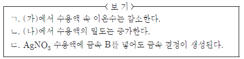 이에 대한 설명으로 옳은 것만을 <보기>에서 있는 대로 고른 것은? (단, A, B는 임의의 금속 원소이고, A이온과 B이온의 전하량은 같으며, 금속의 상대적 질량은 B < A < Ag이다.) [3점]