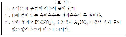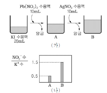 그림 (가)는 요오드화칼륨(KI) 수용액에 질산납(Pb(NO3)2) 수용액과 질산은(AgNO3) 수용액을 차례로 넣은 것을, (나)는 혼합 용액 A와 B속에 존재하는