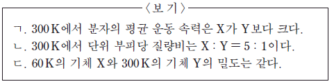 - 그림에서 기체 X와 Y의 질량에 따른 부피를 비교하면, 기체 X의 질량이 더 크기 때문에 기체 X의 부피가 더 작다는 것을 알 수 있다. 따라서 기체 X의 질량은 기체 Y의 질량보다 크다. (ㄱ)