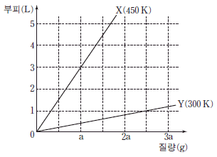 [과목 구분 없음] 그림은 1 기압에서 기체 X와 Y의 질량에 따른 부피를 나타낸 것이다. 기체 X와 Y의 온도는 각각 450K와 300K이다.