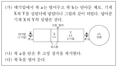 [과목 구분 없음] 다음은 일정한 온도에서 기체 X와 Y의 성질을 알아보기 위한 실험이다.