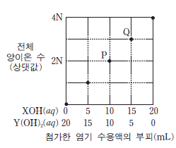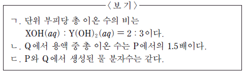 - "ㄷ" : 혼합 용액의 전체 양이온 수가 최소가 되는 지점은 XOH와 Y(OH)2의 부피가 같을 때이다. 이 때, XOH와 Y(OH)2의 농도가 같아지므로, 단위 부피당 양이온 수도 같아진다.