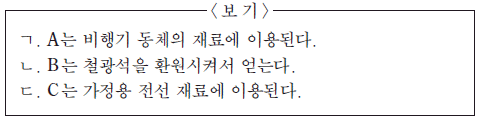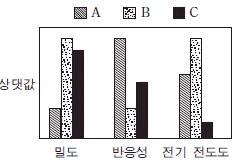 [과목 구분 없음] 그림은 금속 A~C의 3 가지 성질을 나타낸 것이다. A~C는 각각 철, 구리, 알루미늄 중 하나이다.