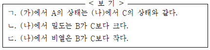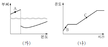 그림 (가)는 물의 온도에 따른 부피를, (나)는 얼음을 단위 시간당 일정한 열량으로 가열할 때 시간에 따른 온도를 나타낸 것이다.