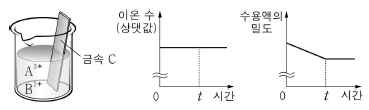 그림은 A3+, B2+이 들어 있는 수용액에 금속 C를 넣었을 때, 시간에 따른 수용액의 이온 수와 밀도를 나타낸 것이다.