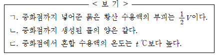 묽은 염산 대신 같은 온도의 묽은 황산(H2SO4) 수용액을 넣어줄 때, 이에 대한 옳은 설명만을 <보기>에서 있는 대로 고른 것은? (단, 실험에 사용한 묽은 염산과 묽은 황산 수용액은 단위 부피당 존재하는 음이온 수가 같다.) [3점]