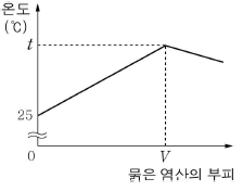 그림은 25℃ 수산화나트륨(NaOH) 수용액 100 mL에 같은 온도의 묽은 염산(HCl)을 조금씩 넣어줄 때, 혼합 수용액의 온도를 나타낸 것이다.