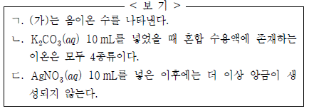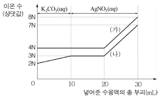 그림은 염화칼슘(CaCl2) 수용액 20 mL에 탄산칼륨(K2CO3) 수용액 10 mL와 질산은(AgNO3) 수용액 20 mL를 차례대로 넣었을 때, 혼합 수용액 속 양이온 수와 음이온 수를 각각 나타낸 것이다.