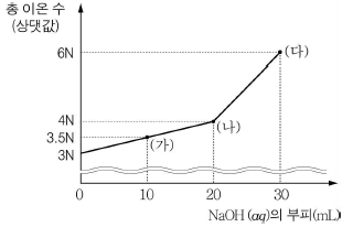 그림은 염화마그네슘(MgCl2) 수용액 10 mL에 수산화나트륨(NaOH) 수용액 30 mL를 조금씩 넣었을 때 혼합 수용액에 존재하는 총 이온 수를 나타낸 것이다.