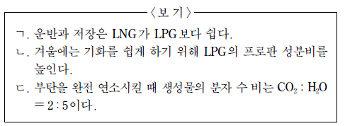 표는 액화 천연 가스(LNG)와 액화 석유 가스(LPG)의 주성분에 관한 자료이고, 그림은 여름과 겨울에 사용되는 차량용 LPG의 프로판 성분비를 나타낸 것이다.