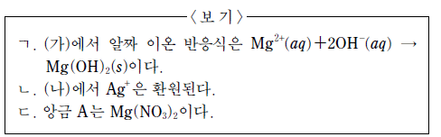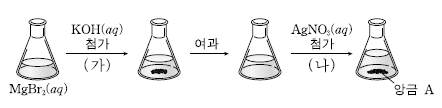 그림은 브롬화마그네슘(MgBr2) 수용액과 소량의 수산화칼륨 (KOH) 수용액을 반응시킨 후 생성된 앙금을 여과하고, 그 여과액에 질산은(AgNO3) 수용액을 넣어 앙금 A가 생성되는 것을 나타낸 것이다.