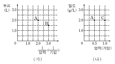 을, (나)는 A, C의 밀도와 압력을 나타낸 것이다.
