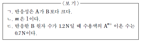 이에 대한 설명으로 옳은 것만을 <보기>에서 있는 대로 고른 것은? (단, m+와 n+는 각각 A, B 이온의 전하이다.) [3점]