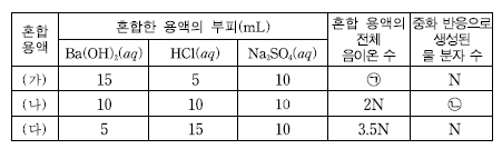 표는 3 가지 수용액을 여러 부피로 혼합한 용액 (가)~(다)의 전체 음이온 수와 생성된 물 분자 수를 나타낸 것이다.