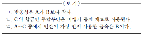 표는 금속 A~C 에 대한 자료이다. A~C는 각각 철, 금, 알루미늄 중 하나이다.