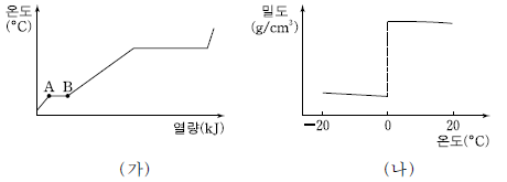 그림 (가)는 일정량의 얼음에 가해준 열량에 따른 온도를, (나)는 온도에 따른 얼음과 물의 밀도를 나타낸 것이다.