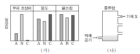 그림 (가)는 건조 공기의 성분 기체 A~C의 부피 조성비와 각 기체의 밀도, 끓는점을, (나)는 액화된 공기로부터 A~C를 분별 증류하는 장치를 나타낸 것이다. A~C는 각각 질소, 산소, 아르곤 중 하나이다.