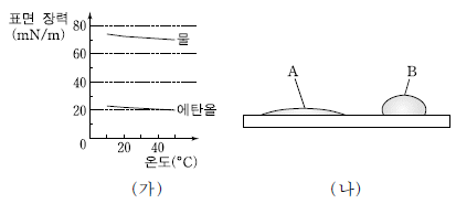 그림 (가)는 온도에 따른 액체의 표면 장력을, (나)는 20℃에서 폴리에틸렌 판 위에 있는 같은 부피의 액체 방울 A, B를 나타낸 것이다. A, B는 각각 물, 에탄올 방울 중 하나이다.