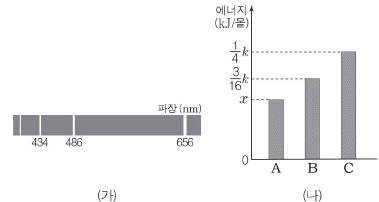 그림 (가)는 수소 원자의 가시광선 영역 선 스펙트럼을, (나)는 발머 계열에 해당하는 전자 전이 A~C에서 각각 방출되는 에너지를 나타낸 것이다. 수소 원자의 주양자수 n에 따른 에너지 준위는