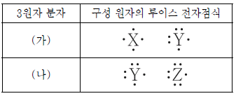 표는 옥텟 규칙을 만족하는 3원자 분자 (가), (나)를 구성하는 원자의 루이스 전자점식을 나타낸 것이다.