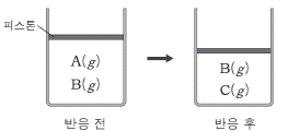 이에 대한 설명으로 옳은 것만을 <보기>에서 있는 대로 고른 것은? (단, 반응 전후 온도와 압력은 일정하며, 피스톤의 마찰과 질량은 무시한다.) [3점]