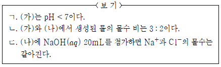 표는 수산화 나트륨(NaOH) 수용액과 묽은 염산(HCl)의 부피를 달리하여 혼합한 수용액 (가), (나)에 존재하는 전체 이온의 몰수를 나타낸 것이다.