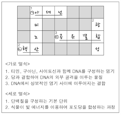 다음은 학생이 낱말 맞추기에 답한 내용이다.