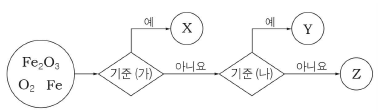 그림은 Fe2O3, O2, Fe을 기준 (가)와 (나)로 분류하는 과정을 나타낸 것이다. X~Z는 각각 Fe2O3, O2, Fe 중 하나이며 기준 (가)와 (나)에 따라 달라질 수 있다.